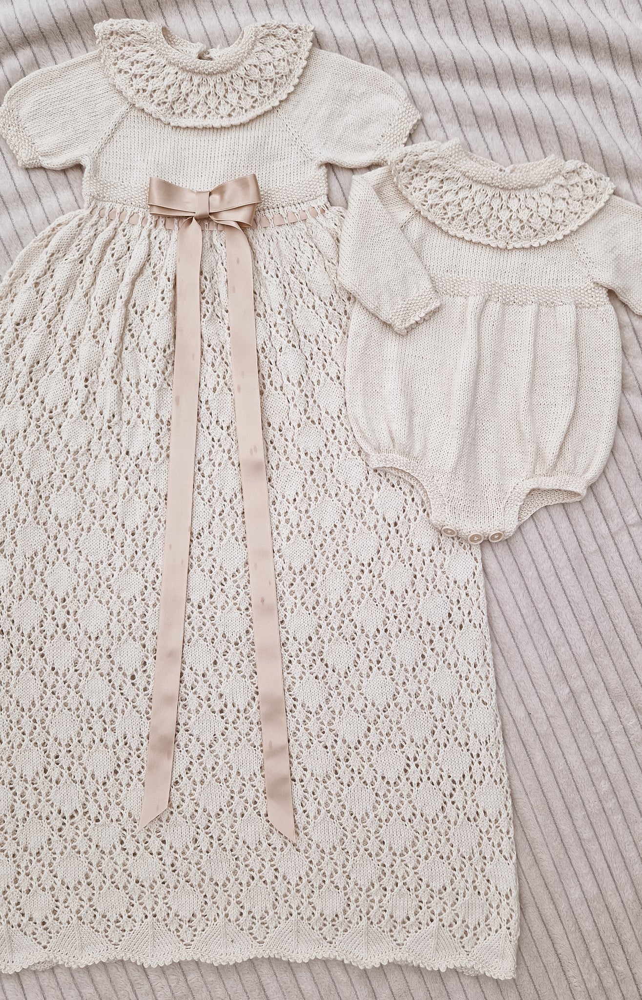 Samfellan er prjónuð ofan frá og niður, með klauf í bakinu og fallegu perluprjóni sem gerir svo mikið fyrir útlitið og er alltaf svo sparilegt finnst mér. Kraginn er með fallegu munstri sem ég er einnig með í kraganum á skírnarkjólnum. Það eru stuttar umferðir á bakhluta og samfellan er hneppt í klofinu. Falleg flík sem hentar vel á nafnadegi, skírnardegi nú eða sem spariflík.